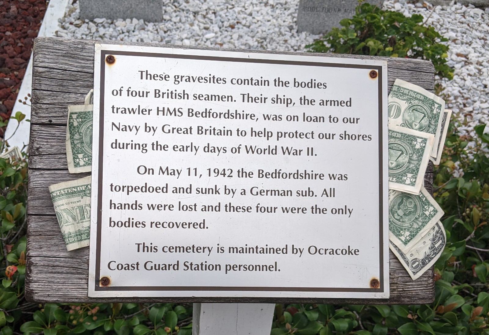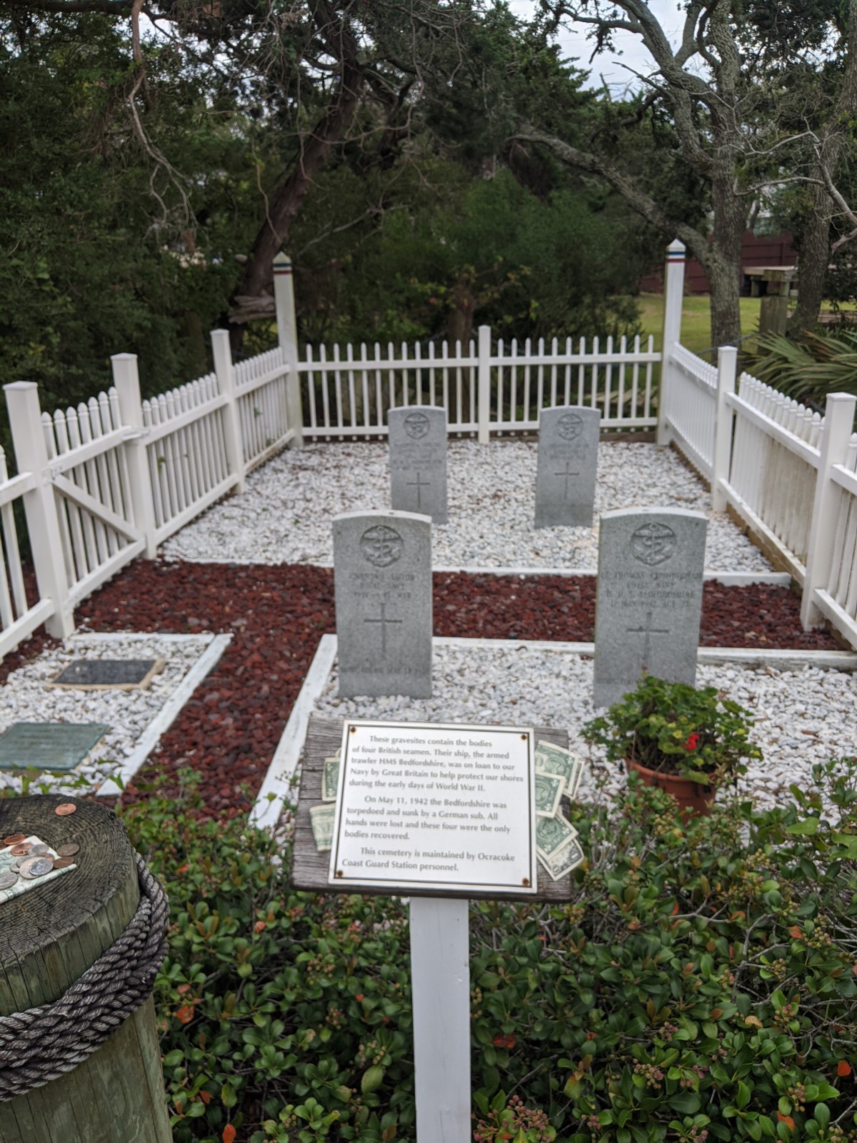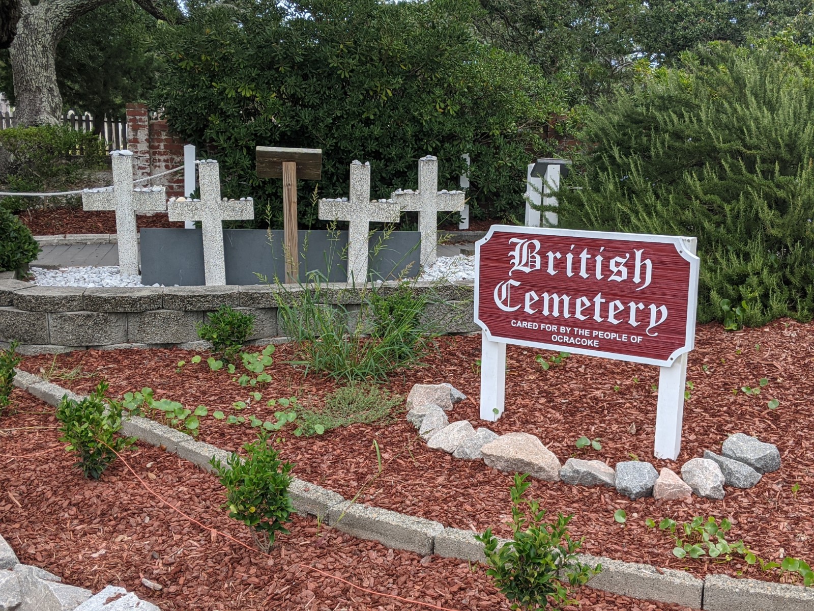 Ocracoke Island is a vacation destination with a fair amount of rooms and homes to rent. We had lunch and hopped on a rented golf cart to explore a bit. The island isn’t huge and this is a good way to get around. We buzzed by the lighthouse, the shopping district (mostly souvenir stuff) and the British Cemetery.