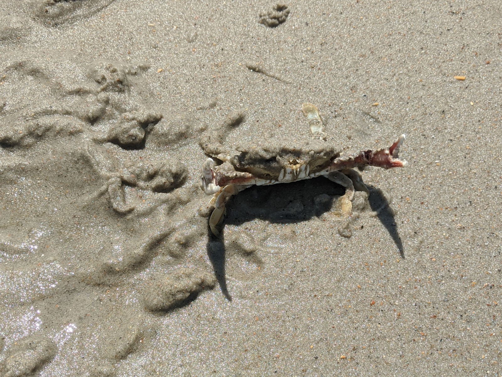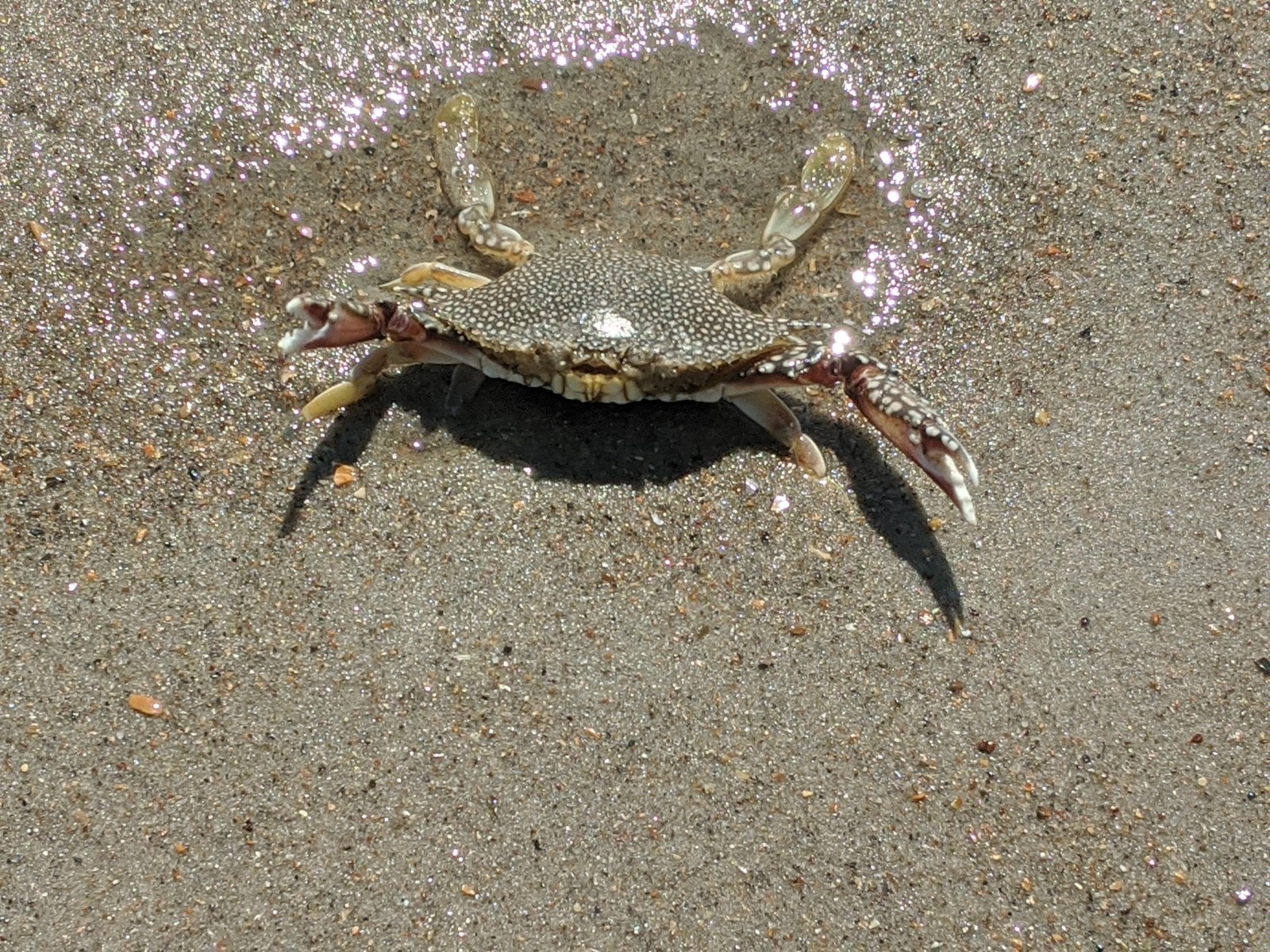 Anyhoo, I’ve never seen crabs this large actually on the beach. As the wave washed over his spot it washed his cover away so he was exposed for a minute or two until we got close. Then he dug back in.