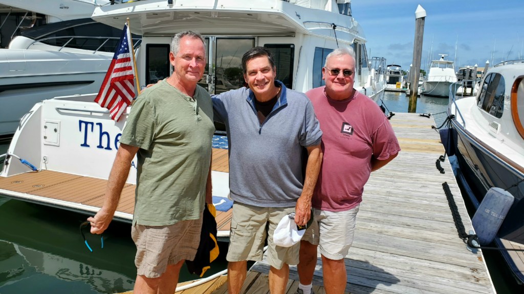Friday, we hosted the aforementioned Rockafellows and another high school buddy, Bill Henry, on Therapy for a boat tour and snacks. Tom hadn’t seen Bill in 45 years but assured me that Bill looked “exactly the same” as he did in high school. We were having a nice visit when Bill invited us all to his home in Ocean City (20 minute drive) for a barbecue!