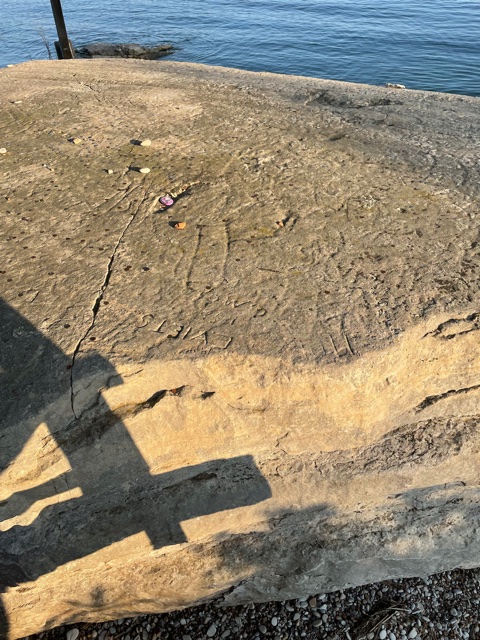 After lunch, we retreated inside the boat to escape the heat. We eventually took off on the bikes around 5:00pm as the heat had subsided a bit. We weren’t up for a long journey but found some cool homes with great views, the glacier grooves, and a large rock of petroglyphs called “Inscription Rock” left by Native Americans they guess less than 1000 years ago.